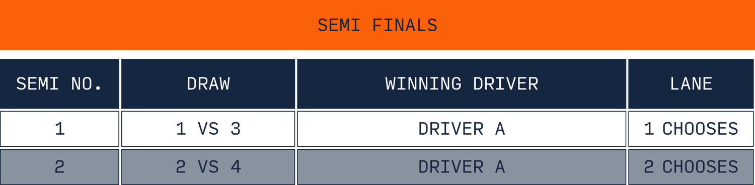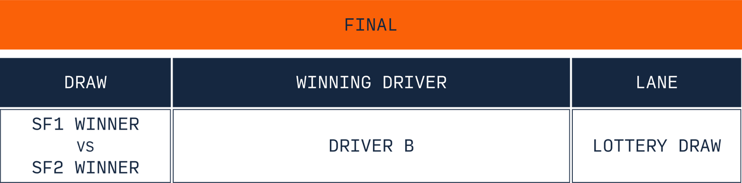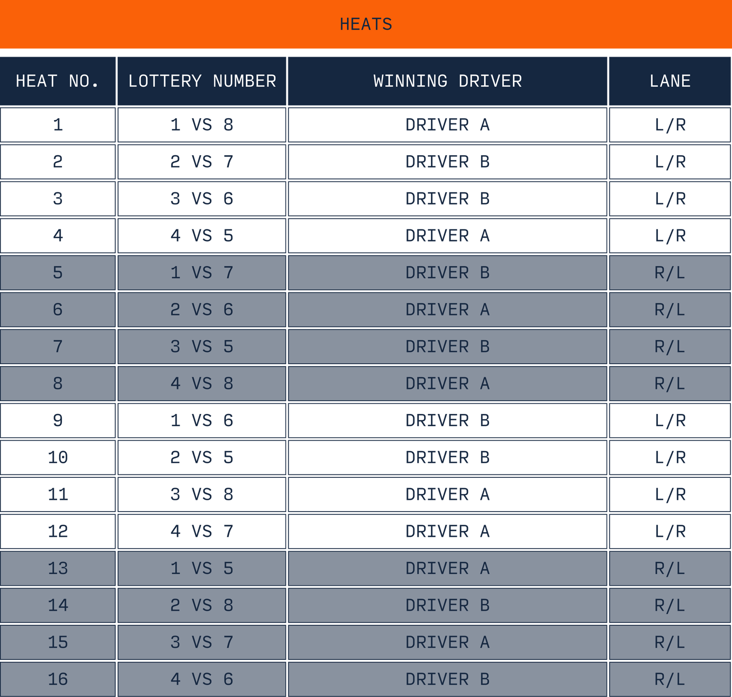 Assigned by a random lottery draw, teams will race 4 times (twice for each driver) in a series of thrilling head-to-head match-ups, with points tallied across all heats.